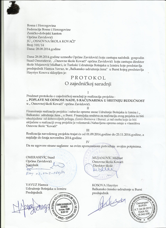 Zavidovici' de Belediye Başkanı Suad Ömerseviç, Zavidavici Kovaci İlköğretim Okul Müdürü Midhat Mujonoviç ile Kalesija'da Belediye Başkanı Rasim Ömeroviç ve Bursa Balkan Kadınlar Derneği'nin Başkanı Hayriye Kosova'lı arasında imzalanan Eğitime Destek Protokolü: