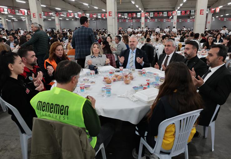 Menemen Belediyesi'nde zam sevinci yaşandı. Menemen Belediye Başkanı Aydın Pehlivan, Halil Alkaya Pazar Yeri'nde tüm birimlerden oluşan belediye personeli ve aileleriyle iftar sofrasında buluştu. Ramazan'ın yalnızca oruç tutmak değil, gönülleri yakınlaştırma ve dayanışmayı güçlendirme anlamını taşıdığını belirten Pehlivan, "bugün burada, sadece bir iftar sofrasının etrafında değil, Menemen’imizin yarınlarını daha güçlü ve daha güzel kılma iradesinde bir araya geldik! Bu birlikteliğimiz, kardeşlik hukukumuz gibi ebedi olsun, aramızdaki dayanışma büyüsün, bereketlensin inşallah." ifadelerini kullandı.
