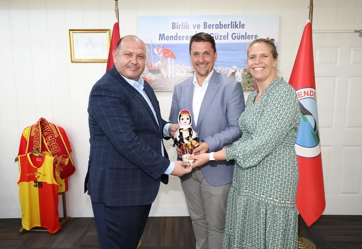 Menderes Belediyesi’nde kardeş belediye ziyareti gerçekleşti. Menderes Belediye Başkanı İlkay Çiçek, Almanya’nın Troisdorf Belediyesi’nin Belediye Başkanı Alexander Biber’i makamında ağırladı. İş birliği adına önemli konuların da masaya yatırıldığı toplantıda samimi diyaloglar ve eğlenceli anlar dikkat çekti. Başkan Çiçek, Başkan Biber’e kendisine ait olan Göztepe formasını hediye etti.