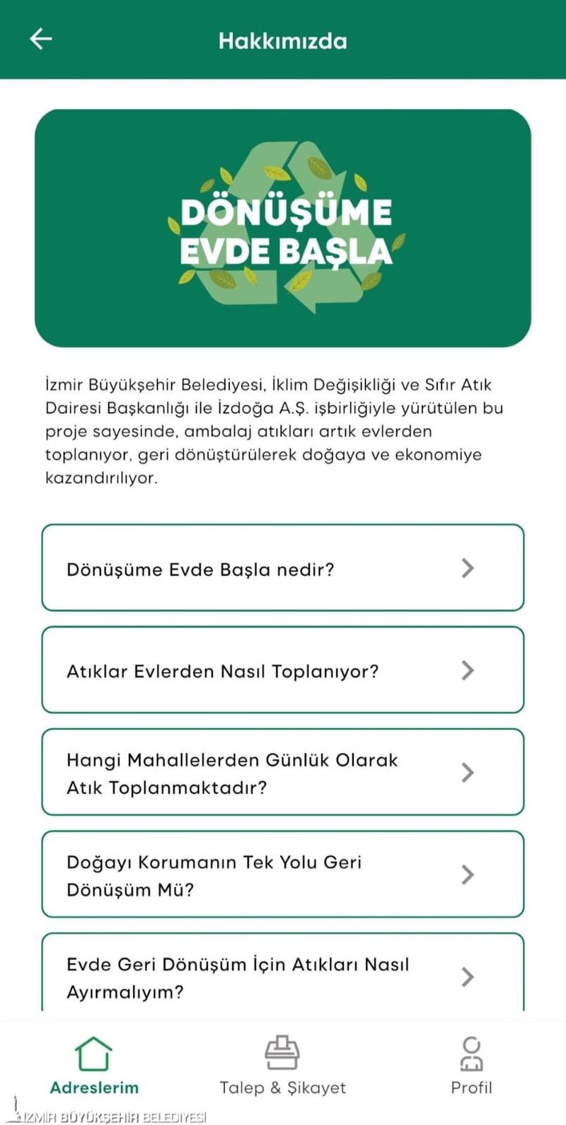 İzmir Büyükşehir Belediye Başkanı Dr. Cemil Tugay’ın göreve gelmesinin ardından başlatılan, ambalaj atıklarının evlerden toplanarak ekonomiye kazandırılmasını sağlayan “Dönüşüme Evde Başla” projesi artık vatandaşın cebinde. Proje kapsamında yer alan ilçe ve mahallelerde yaşayan vatandaşlar için mobil uygulama geliştirildi. “Dönüşüme Evde Başla” yazarak indirilen uygulamayla pilot mahallelerde yaşayan vatandaşlar, talep ve şikâyetlerini kolaylıkla iletebilecek.