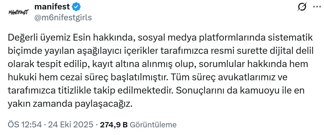 Manifest, grup üyesi Esin Bahat hakkında sosyal medyada yayılan aşağılayıcı içeriklerin tespit edilip kayıt altına alındığını, sorumlular hakkında hukuki ve cezai sürecin başlatıldığını duyurdu.