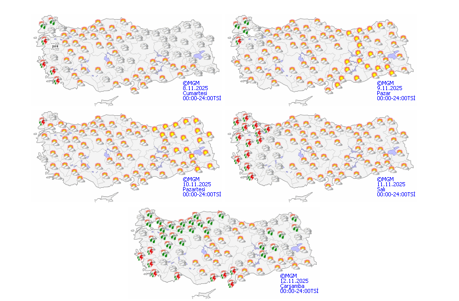 Meteoroloji Genel Müdürlüğü, 8-9 Kasım 2025’te hava sıcaklıklarının mevsim normallerinin üzerinde seyredeceğini açıkladı. Trakya ve Kıyı Ege’de aralıklı sağanak ve gök gürültülü sağanak yağış bekleniyor. Sıcaklıkların salı gününden itibaren düşmesi bekleniyor.