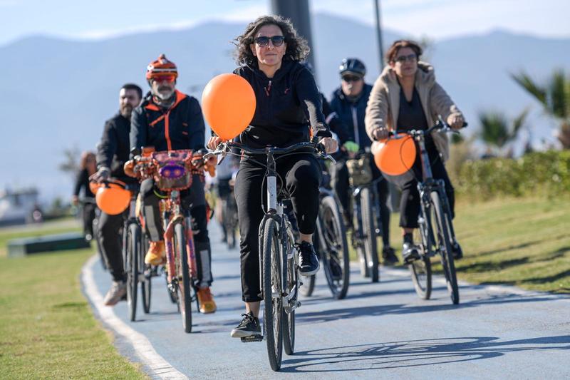 Kadınlar turuncu giysileriyle Vasıf Çınar Meydanı’nda buluştu. “Şiddete Karşı Pedal Çevir” ekibi ise Karantina sahilinden yola çıktı. Bir araya gelen iki ekip, Lozan Kapısı’ndan Kültürpark’ta yer alan etkinlik alanına birlikte yürüdü. Vatandaşlar, evlerinin balkonlarından sloganlarla korteje destek verdi. Yüzlerce “turuncu” kıyafetli kadın, Kültürpark’ın Lozan Kapısı girişinde alkışlarla karşılandı.