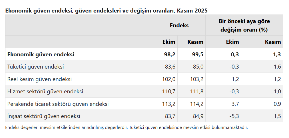 Tüketici güven endeksi kasımda yüzde 1,6 yükselerek 85,0 seviyesine çıktı. Reel kesim (imalat sanayi) güven endeksi %1,2 artışla 103,2 değerine ulaştı.
