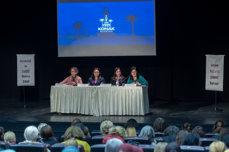 Konak Belediyesi’nin Dr. Selahattin Akçiçek Kültür Merkezi’nde düzenlediği “Kadına Yönelik Şiddetle Mücadelede Belediyelerin Rolü” paneli, alanında uzman isimleri bir araya getirdi. Kadınların yoğun ilgi gösterdiği panelin açılışı konuşmasını Konak Belediye Başkanı Nilüfer Çınarlı Mutlu yaparken, Cinsiyet Eşitliği İzleme Derneği İzmir İl Koordinatörü Ayla Çelik moderatörlüğünde; İzmir Şiddet Önleme ve İzleme Merkezi (ŞÖNİM) Müdürü Sosyal Hizmet Uzmanı Güliz Kuli, İzmir Kadın Dayanışma Derneği’nden Psikolog Seher Gündoğan ve İzmir Barosu Kadın Hakları Merkezi’nden Avukat Arzu Hazer Güngör konuşmacı olarak yer aldı. Ayrıca Konak Belediyesi Kadın ve Aile Hizmetleri Müdürü Nursun Karaburun Akıncı da müdürlük bünyesinde yapılan çalışmaları anlatan bir sunum gerçekleştirdi. Kadına yönelik şiddetle mücadelede belediyelerin rolü, kadın danışma ve dayanışma merkezlerinin önemi, hukuki mekanizmalar ve kurumlar arası işbirliği konuları üzerinde duruldu.
