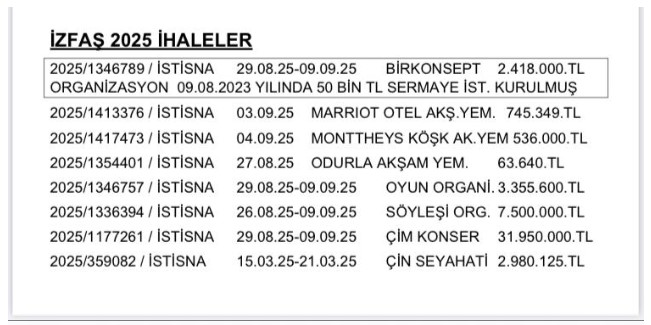 Atmaca İZFAŞ’ın 3 Eylül’de Marriot Otel’de tek bir akşam yemeğine 745 bin TL ödediğini, bir gün sonra Monttheys Köşkü’nde gerçekleştirilen davetteki akşam yemeğinin maliyetinin 536 bin lira, OdUrla’daki bir başka yemeğin bedelinin ise 63 bin 640 lira olduğunu belirtti.