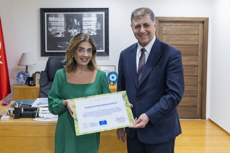 Avrupa Konseyi’nin kültür rotalarından Iter Vitis Rotaları Ağı’na üye olan İzmir, turizmde konumunu güçlendiriyor. Iter Vitis Başkanı ve Avrupa Temsilcisi Emanuela Panke İzmir Büyükşehir Belediye Başkanı Dr. Cemil Tugay’ı ziyaret ederek üyelik sertifikasını verdi. Başkan Tugay, kentin kültürünün, kültürel değerlerinin uluslararası alanlarda yer almasıyla İzmir turizmini daha iyi yerlere getireceklerini söyledi.