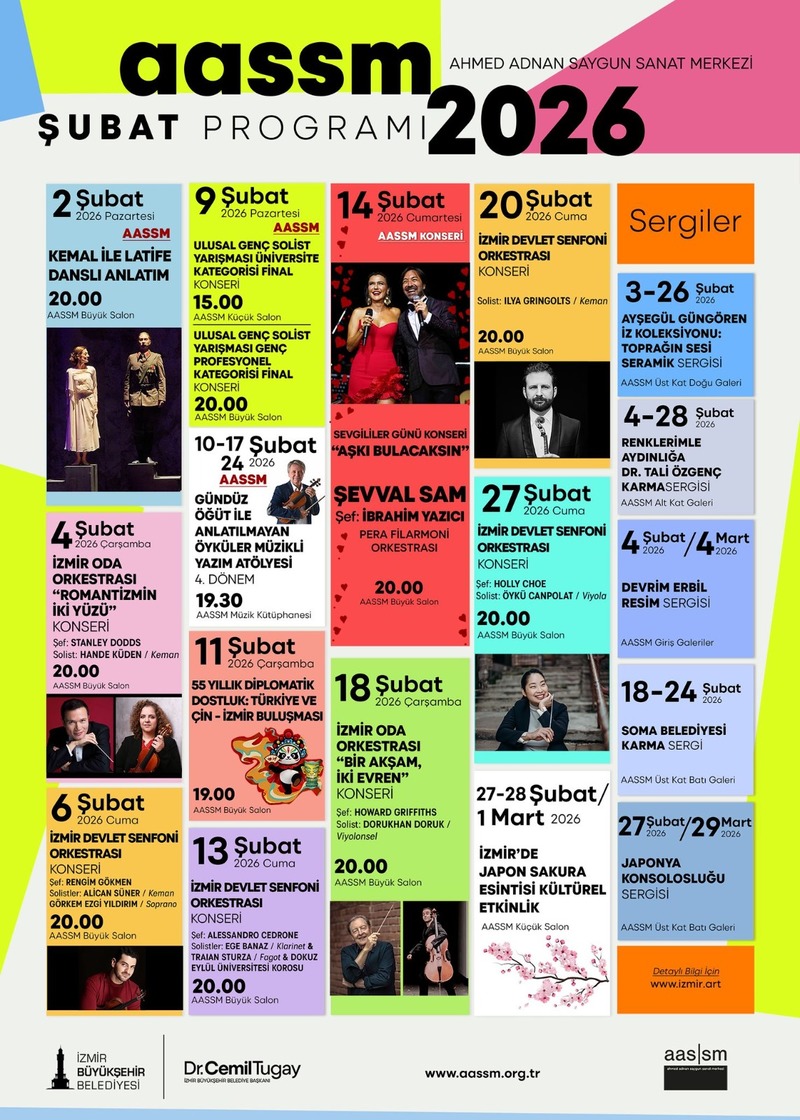 Ahmed Adnan Saygun Sanat Merkezi (AASSM), şubat ayı boyunca müzikten dansa zengin programıyla sanatseverleri ağırlayacak. Müzikal yarışmalar, konserler, özel temalı performanslar, atölyeler ve sergiler ile İzmir’de sanatın nabzı tutulacak.