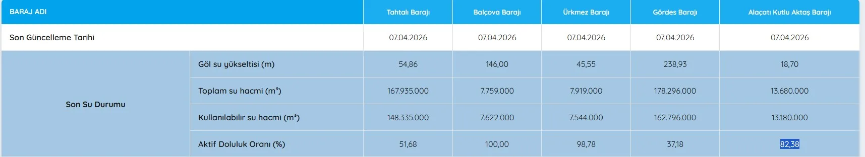 Alaçatı Kutlu Aktaş Barajı: %82,38