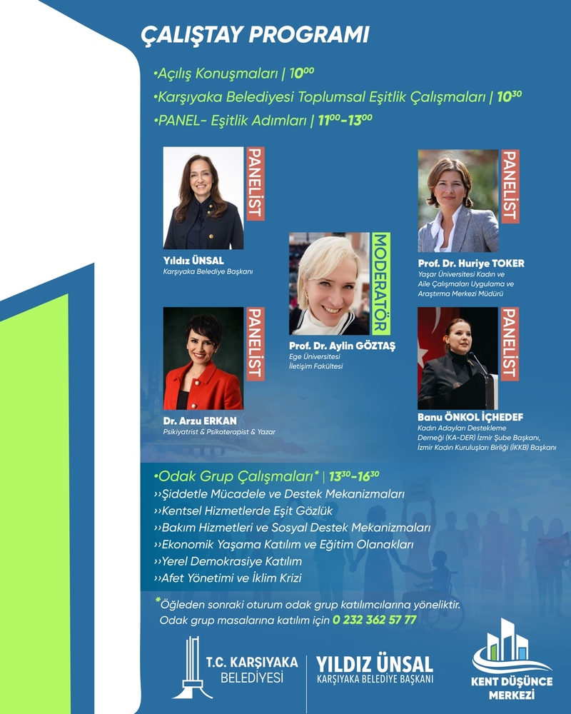 Çalıştayın öğleden sonraki oturumunda ise ‘Şiddetle Mücadele ve Destek Adımları’, ‘Kentsel Hizmetlerde Eşit Gözlük’, ‘Ekonomik Yaşama Katılım ve Eğitim Olanakları’ gibi başlıklarda 6 ayrı odak grup çalışması gerçekleştirilecek. Tüm vatandaşların katılımına açık olan çalıştayda, odak grup masalarına katılım için 0232 362 57 77 numaralı telefondan kayıt yaptırılabilecek.